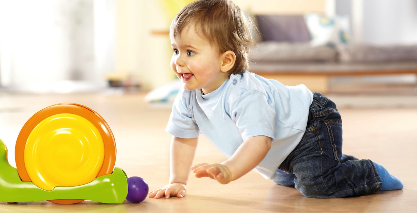 Иногда взрослый как бы подманивает ребенка лежащей в отдалении игрушкой. Обстановка при этом должна быть доброжелательной. Сначала малыш будет тянуться за игрушкой, вращаться на животе вокруг себя и экспериментировать с переворотами с живота на спину и обратно. Затем он начинает раскачиваться, стоя на четвереньках, прицеливаясь к какому-то предмету, и иногда ему удается «нырнуть» вперед.