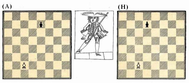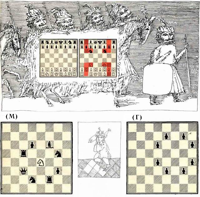 Вадик сначала снял черную пешку и поставил на ее место белую. Потом поставил обе пешки обратно и снял белую пешку, а на ее место поставил черную. Получалось, что каждая пешка может бить другую, нужно только, чтобы был ее ход. И снова поставил Вадик на середину доски белую пешку, а перед ней поставил с одной стороны черную пешку (Г), а с другой черного коня.