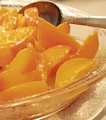 Разделить апельсин на дольки, положить в вазочку с горстью сухого или намоченного изюма, грецкими орехами.