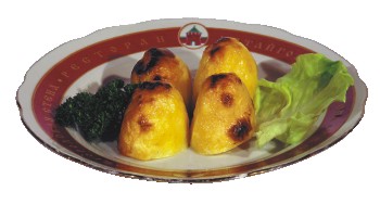 Картофель испечь, очистить, срезать верхушки, сделать выемки такой глубины чтобы стенки могли удержать фарш. Вынутую массу размять, облить маслом, смешать с шинкованным поджаренным в масле луком и нафаршировать картофель. Сбрызнуть его маслом, прогреть.