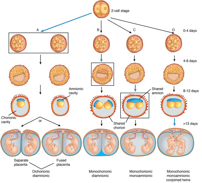 Дело в том, что иногда в момент зачатия происходит оплодотворение сразу двух яйцеклеток, и обе они выживают, прикрепляются к стенке матки, и начинают свое развитие. Еще одна причина получения двойни – деление одной яйцеклетки оплодотворенной на два эмбриона.