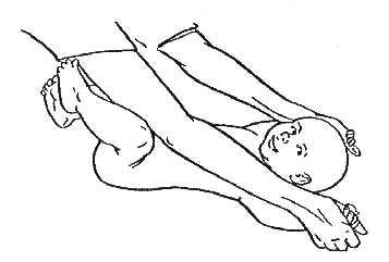 По окончании валяния нужно приступить к щшщеобразному разминанию нижних конечностей. Для выполнения упражнения необходимо положить ногу ребенка на ладонь правой руки и поддерживать ее в нижней части голени. С помощью указательного и большого пальца левой руки нужно захватить наружную поверхность голени и смещать мышцы по направлению к большому пальцу от стопы к бедру и обратно. Процедуру следует закончить несколькими поглаживаниями.