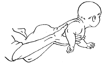 Если к 4-месячному возрасту у ребенка исчез гипертонус мышц и сгибание ног не приносит ему неприятных ощущений, то рекомендуется сделать под его коленками несколько поглаживающих движений по направлению сверху вниз.