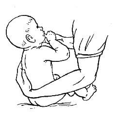 Упражнение способствует укреплению мышц передней поверхности шеи, спины и стимулирует развитие брюшного пресса. Для его выполнения следует вложить в ладошки ребенка большие пальцы рук и заставить его сжать кулачки. Остальными пальцами массажист должен поддерживать ребенка за запястья.