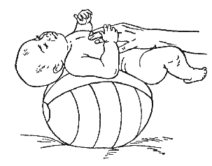 Уложить ребенка на мяч вниз животом. Чтобы малыш принял устойчивое положение, его ноги должны быть слегка разведены. Затем нужно осторожно раскачивать мяч то в одну, то в другую сторону.