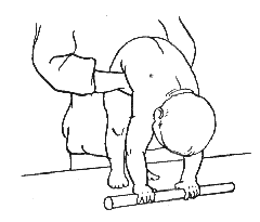 В 9-месячном возрасте ребенок умеет свободно ползать, сидеть, делает первые попытки ходить как с помощью взрослых, так и самостоятельно. Это позволяет усложнить многие гимнастические упражнения, ввести в постоянное употребление гимнастические снаряды, в качестве которых можно использовать деревянную палочку, большой надувной мяч, детские пластмассовые кольца, погремушки с круглой или овальной ручкой и т. д.