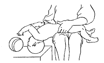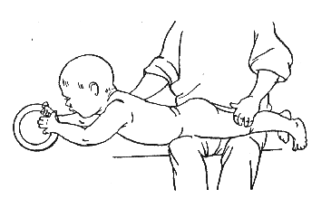 Исходное положение: лежа на животе. Массажист кладет ребенка себе на колени так, чтобы у него провисали грудь и плечи, и просит его достать с пола игрушку или дотронуться до нее руками (рис. 302). Ноги малыша при этом необходимо придерживать.