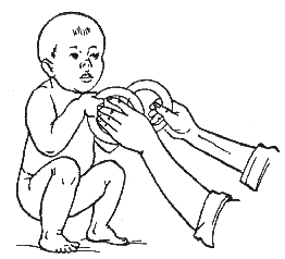 Дать ребенку в руки кольца, слегка потянуть за них вниз, в результате чего малыш должен присесть (рис. 304). Затем подержать ребенка в таком положении 1-2 секунды и, снова потянув за кольца, помочь ему подняться. Можно заставить малыша встать на носочки, для этого его надо взять за руки и слегка приподнять. Упражнение повторить 2 раза.