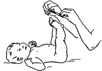 Массаж стоп (рис. 7).Поддерживая указательными пальцами обеих рук слегка приподнятыё стопы ребенка, большими пальцами производят поглаживание тыльной поверхности стопы в направлении от пальцев к голеностопному суставу и вокруг этого сустава — 4-6 раз, после этого растирают — 2-3 раза.