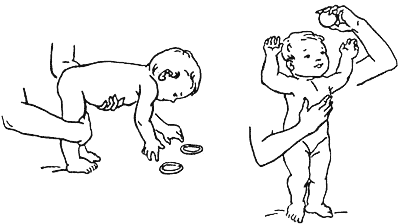 Исходное положение: ребенок стоит, прислонившись спиной к взрослому. У ног ребенка кладут. игрушку, удобную для захватывания. Взрослый фиксирует колени ребенка правой рукой, а левой поддерживает его за живот. Словами «возьми, возьми» ребенка побуждают наклониться и, взяв игрушку, снова выпрямиться. 2-3 раза.