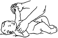 Для углубления дыхания грудную клетку плотно обхватывают двумя руками так, чтобы большие пальцы находились на груди под сосками. Ладонями обеих рук приподнимают кверху кожу грудной клетки ребенка, производя круговые движения, расширяющие грудную оетку. Прием проводят в медленном темпе. 4-6 раз.