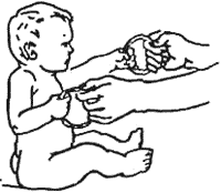 Исходные положения: лежа, сидя, стоя лицом к взрослому. Ребенку дают обхватить небольшие кольца, которые держит взрослый, и производят сгибание и разгибание рук в локтевых суставах. При сгибании одной руки разгибают другую. 5-6 раз каждой рукой.