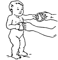 Исходное положение: стоя спиной к взрослому. Взрослый одной рукой удерживает малыша за живот, а в другой держит игрушку на высоте вытянутых рук ребенка. Ребенок должен достать игрушку. 4-6 раз.