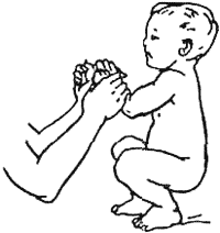Исходное положение: стоя лицом к взрослому. Взрослый придерживает ребенка за обе согнутые в локтях руки и побуждает его к приседанию словами «присядь, присядь», «стань маленьким». 2-3 раза.