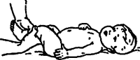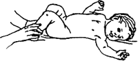 Исходное положение: на спине, ногами к краю стола. При удержании ребенка правой рукой за его прямые ноги, а левой — за его согнутую в локте правую руку путем поворота таза стимулируют поворот ребенка со спины на живот влево. Для поворота ребенка вправо надо левой рукой обхватить ноги ребенка, а правой — его согнутую в локте левую руку. 1-2 раза в каждую сторону.