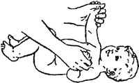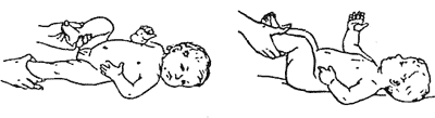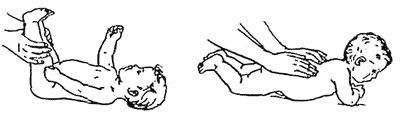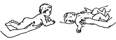 Исходное положение: на спине, ногами к краю стола. При удержании ребенка правой рукой за выпрямленные ноги, а левой — за согнутую в локте правую руку ребенка, путем поворота таза стимулируют поворот со спины на живот влево. Для поворота ребенка вправо надо левой рукой обхватить ноги ребенка, а правой — его согнутую в локте левую руку. 1 - 2 раза в каждую сторону.