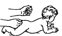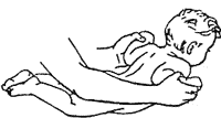 Исходное положение: на животе, ногами к краю стола. Взрослый подводит ладони рук под живот или под грудь ребенка и приподнимает его над столом. Происходит рефлекторное разгибание тазобедренных суставов и позвоночника при отклонении головы назад. I -2 раза.