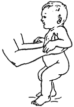 Исходное положение: ребенка ставят лицом к взрослому. Поддерживая малыша обеими руками под мышки, побуждают его к переступанию, и он делает 3-6 шагов.