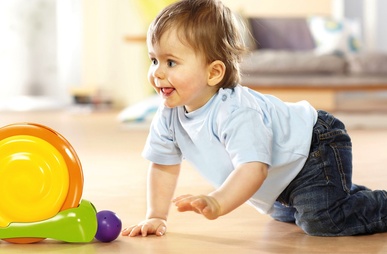 Разложите на различном расстоянии игрушки (предметы). Их не должно быть слишком мало или слишком много, чтобы ребенок не потерял интереса к ним. Обычно 3-5 предметов вполне достаточно. Часть игрушек ребенок может достать, поворачиваясь вокруг своей оси, а часть - только при движении вперед.