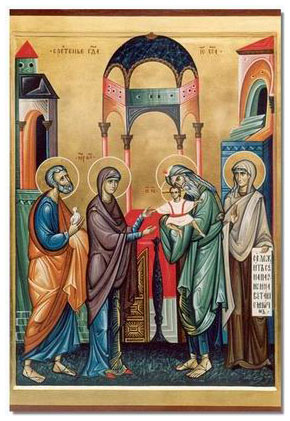 На 40-й день по Рождестве Христовом Богородица Мария, исполняя предписание закона Моисеева, принесла Младенца Иисуса в Иерусалимский храм.