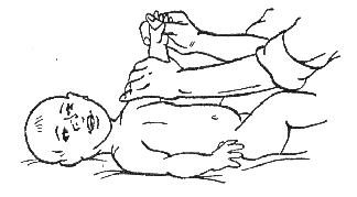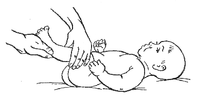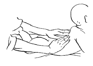 Ребенка следует положить на спину, массажист должен встать к его ногам.