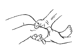 Положить правую ногу ребенка на ладонь левой руки. Правой рукой произвести