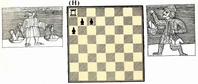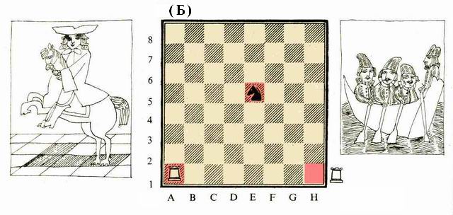 Вадик сначала снял черную пешку и поставил на ее место белую. Потом поставил обе пешки обратно и снял белую пешку, а на ее место поставил черную. Получалось, что каждая пешка может бить другую, нужно только, чтобы был ее ход. И снова поставил Вадик на середину доски белую пешку, а перед ней поставил с одной стороны черную пешку (Г), а с другой черного коня.