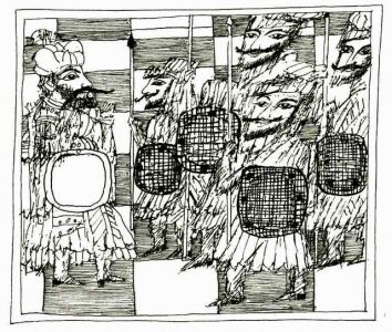 Васе и Сереже хотелось поскорее узнать про коня. Он казался им самой привлекательной фигурой. Ну, что ладья? Как она ходит, понятно, а что она такое, с чем ее сравнить можно? С танком? С пушкой? И похоже, и непохоже. Какая-то все-таки неясная фигура. То ли дело конь! Тут сразу представляешь себе лихого кавалериста. Лошадь под ним то встает на Дыбы, то гарцует, то шарахается в сторону. А когда надо — мчится в атаку, перепрыгивает через препятствия. А как ведет себя конь на шахматной доске? Вадик как-то сказал им во дворе, что конь ходит буквой «Г», но это было не очень понятно. Поэтому ребята с нетерпением ждали, когда же папа Вадика снова будет рассказывать о шахматах. Они надеялись, что теперь очередь дойдет до коня — ведь стоит он рядом с ладьей. Вася на всякий случай повторял про себя «бэ один», «жэ один», «бэ восемь», «жэ восемь» — названия полей, на которых стоят кони в начале игры. Куда же они поскачут? …На столе перед дядей Леней стояли расставленные шахматы. Сплошная шеренга пешек прикрывала фигуры.