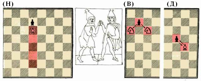 — Пешка идет все время прямо, а если упрется в какую-нибудь пешку или фигуру, (Н) то дальше идти не может.