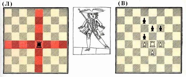 — У ладьи характер прямой: ходит она только прямо — вперед, назад, влево, вправо и на любое расстояние. Если у ладьи на дороге стоит неприятельская фигура, ладья может эту фигуру сбить и встать на ее место. А если на пути у ладьи свои фигуры— (В) хода ей нет.
