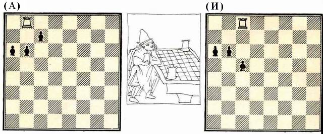Сережа предложил пойти ладьей на поле а8, но дядя Леня двинул пешку на одно (Н) поле, и она оказалась защищенной другой пешкой.