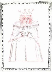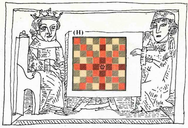 В этот день Вадик не вышел гулять во двор, и Вася с Сережей пошли к нему домой. Только они позвонили, как дверь широко распахнулась, и пораженные ребята увидели перед собой короля! На голове его красовалась зубчатая корона, а в руке был знак королевской власти — скипетр. Правда, скипетр почему-то напоминал складной зонтик, а королевская корона была вырезана из обложки журнала «Огонек». И все-таки это был настоящий шахматный король. Что шахматный, ребята сразу догадались, потому что вместо панциря его грудь прикрывала картонная клетчатая доска.