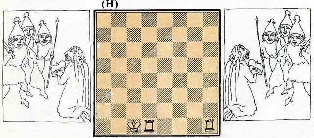 — Помните, приятели, как ферзь ходит? Прямо и наискосок во все стороны. Король тоже ходит прямо и наискосок во все стороны, но только на одно поле — шаг у него короткий. По скорости передвижения король не уступает лишь пешке, а за другими фигурами ему не угнаться. Вернее сказать, от других фигур ему убежать трудновато, потому что король чаще спасается бегством, а не преследует неприятеля (М). И все же он самая главная фигура в шахматах, потому что по правилам без короля играть нельзя. Шахматная война ведется для того, чтобы поставить неприятельского короля в безвыходное положение. Тогда — победа! У вас может быть в этот момент сколько угодно фигур и пешек, но если ваш король не в состоянии избежать гибели, вы проиграли. Вот почему король самая главная фигура в шахматах.