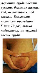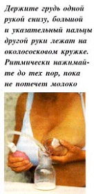 Прежде всего вымойте руки с мылом. Затем положите большой и указательный пальцы на внешнюю границу околососкового кружка и сильно и ритмично сжимайте пальцы.