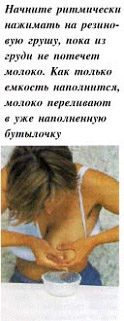 Сцеживание молока обеими руками рекомендуется также в случаях трещин на сосках, когда прикосновение к ним становится болезненным. Для сцеживания руками поставьте перед собой миску на уровне груди, тогда Вам не придется сильно наклоняться. Сцеживание должно продолжаться для каждой груди от 5 до 8 минут. Сцеженное молоко хранится в холодильнике в стерилизованных бутылках или свежезамороженным в пластиковом контейнере. Важно, чтобы сразу после процедуры оно было охлаждено (в холодильнике его можно хранить 48 часов, в морозильной камере около б месяцев). Сцеженным молоком ребенка может покормить отец или кто-то другой, если матери нет дома. Кормление из бутылочки, конечно, не должно происходить очень часто, для того чтобы - как уже было сказано - не приучать ребенка к более легкому способу получения пищи.
