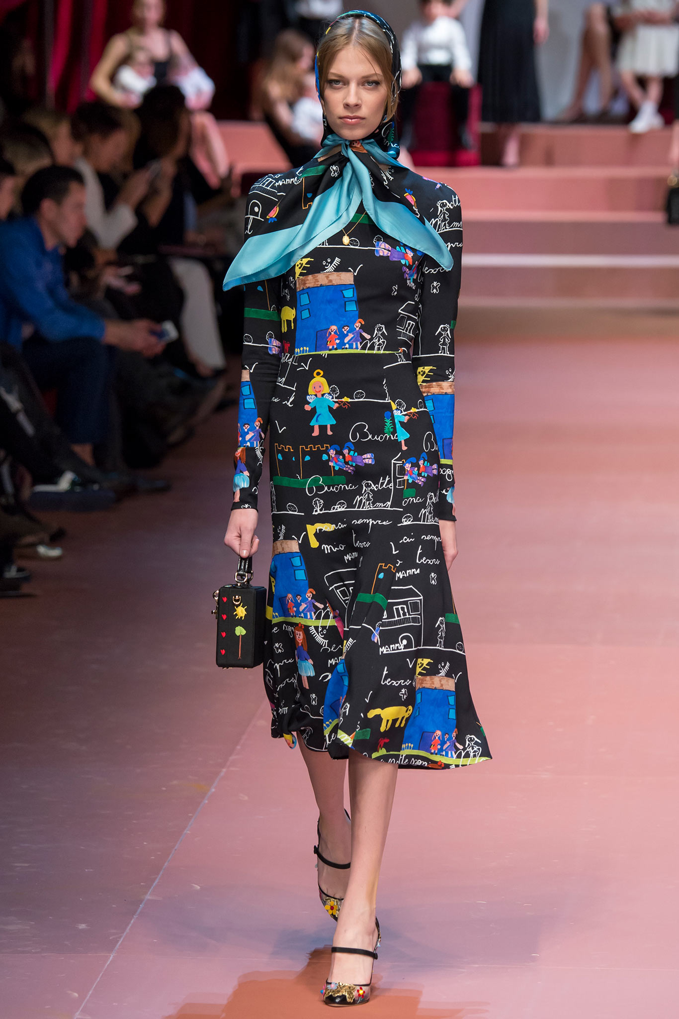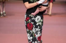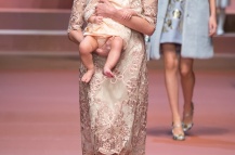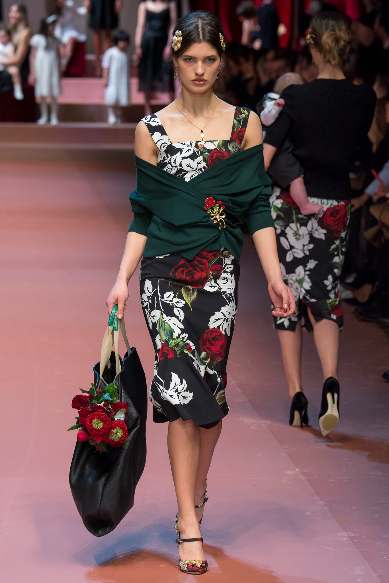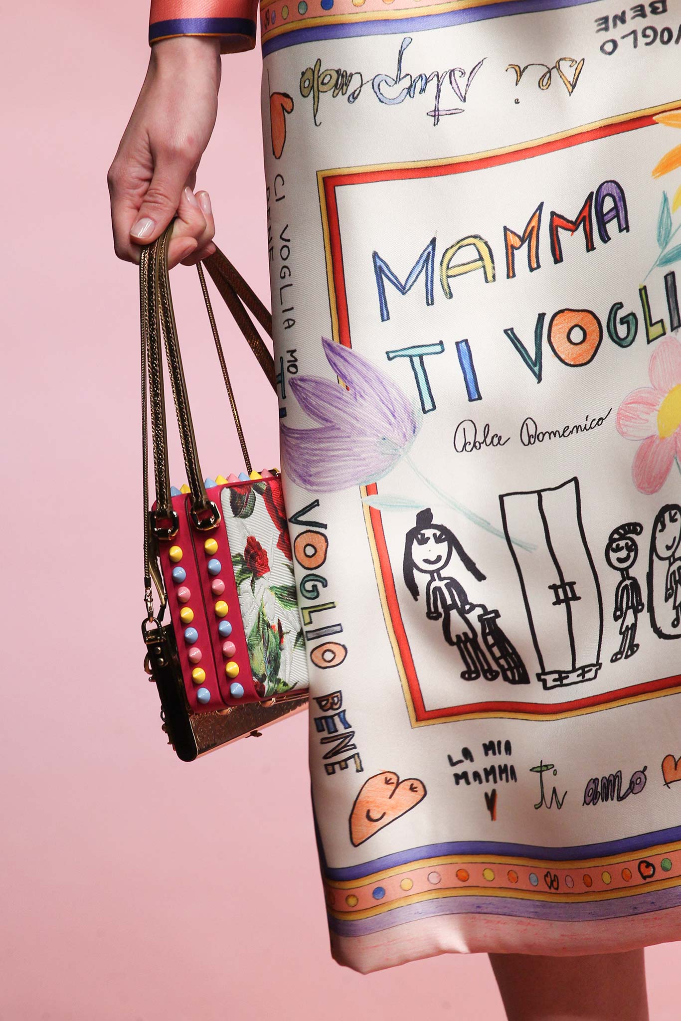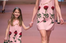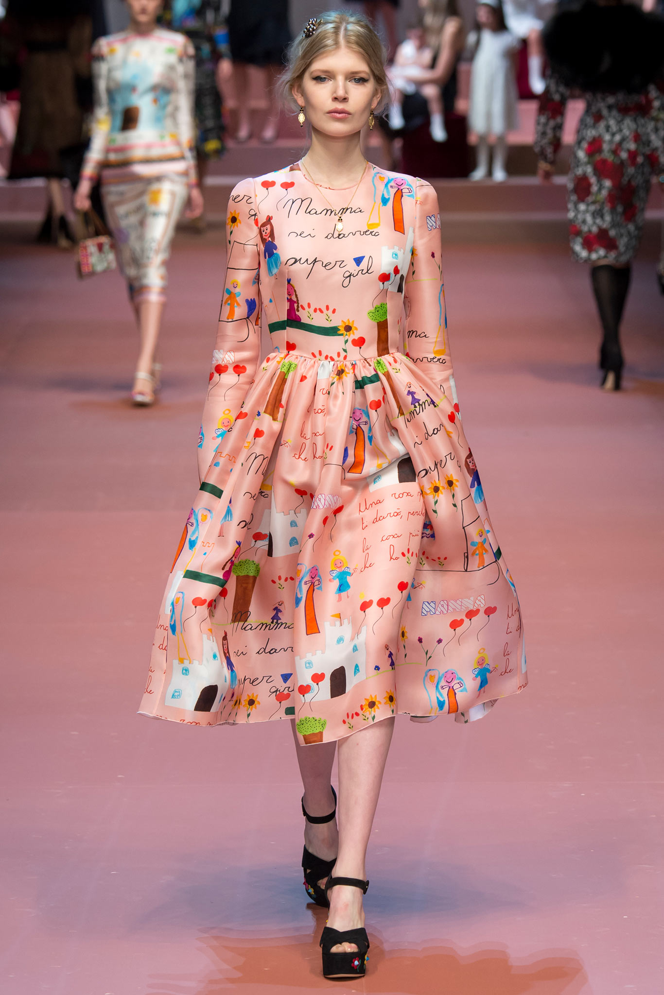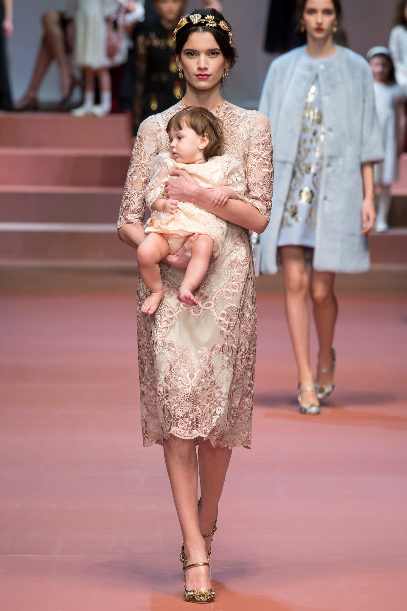 «Viva La Mamma!» — коллекция, посвященная материнству! Она добрая, яркая, сказочная и очень красивая! На платьях модельеры использовали принты детских рисунков, декорировали одежду, сумки и даже обувь цветами. В показе задействованы дети, которые держат за руку маму, сидят на руках или даже в животике)